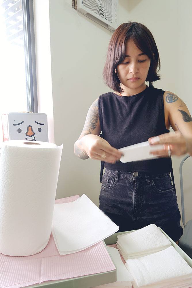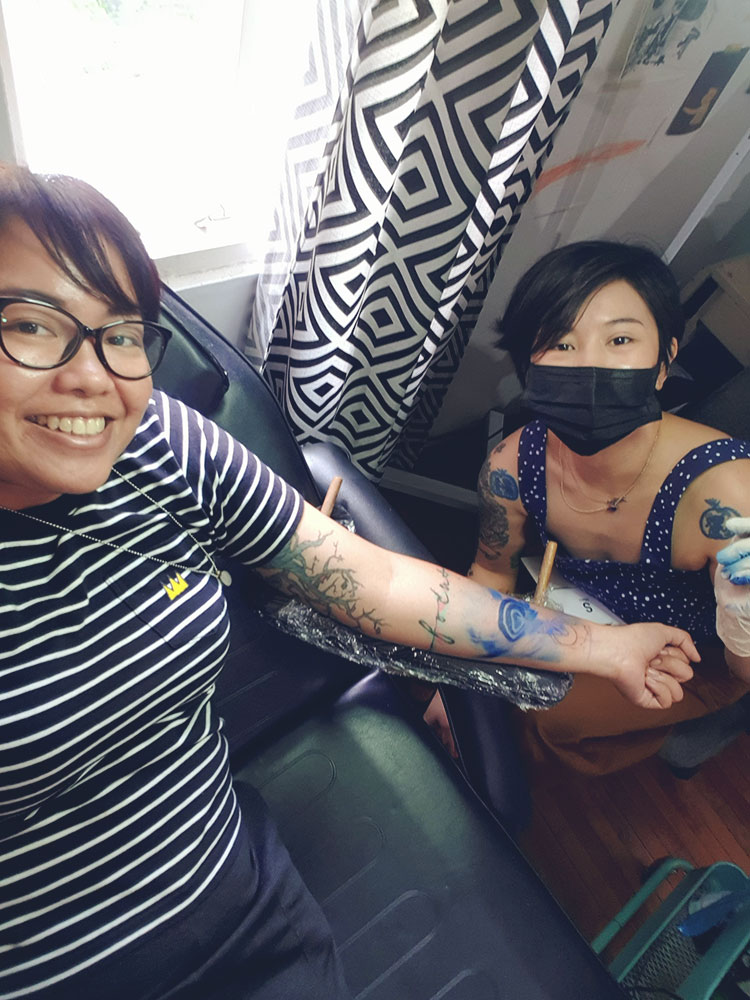 Wiji has always struck me as a talented artist. Sheβs a graduate of Political Science at the De La Salle University and for a time employed what she had learned in her work, but she soon caved in and began to produce art, which has always been her passion. While Wiji recalled that I accompanied her while she got a tattoo, I likewise remember that she joined me when I had inks done by other tattoo artists until she began tattooing me herself. She has an interesting story on how she did her first tattoo and it was on a common friend of ours. Wiji got invited to a friendβs birthday and when she got to the venue, which was at a tattoo shop, our friend, the birthday boy, was lying down on a tattoo chair. βHe had frames tattooed on his back and he wanted everyone at the party to tattoo him,β shares Wiji. Professional tattoo artist Dyun Depasupil was there at the party and he was the one who guided everybody, including Wiji, on how to properly use the tattoo gun. From there, Wiji had an epiphany that she wanted to try her hand on tattooing, so she sent a message to Dyun asking whether he can get her to be his apprentice. βHe did not respond. It’s been about a week, and I’m still thinking about it, so I texted him again. When I texted Dyun again, he said, βYou passed the first test.β He wanted to know whether I was serious, and if it wasn’t simply a passing thought because many wanted to be his apprentice,β Wiji says. From there, Wiji started going to 55Tinta, a tattoo shop where Dyun used to be part of, and observed Dyunβs process as well as assisted him. βI made a point to not interfere. Dyun was my teacher. I am also grateful to Dyun’s tattooing contemporaries there at the shop for also teaching me,β says Wiji.