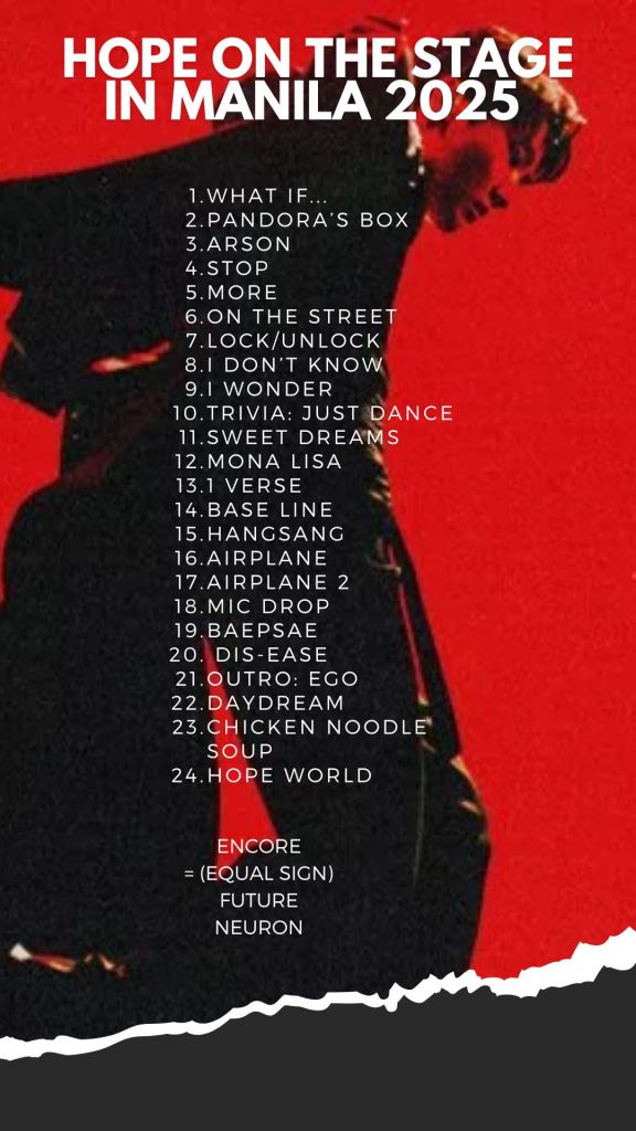 It was clear throughout the concert that j-hope poured his heart into every detail of this tour. Seeing the overwhelming love from Filipino ARMYs, hearing the chants of “j-hope!” fill the SM Mall of Asia Arena, and witnessing his growth as an artist made it a night that none of us will ever forget. Hope on the Stage in Manila wasn’t just a concert — it was a celebration of how far j-hope has come, and a reminder of how much love he inspires across the world.